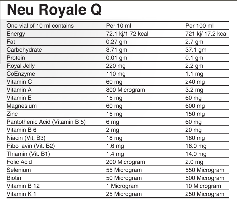 NEU ROYALE Q® contains Royal Jelly and Pollen which may cause sensitivity reactions in some patients.